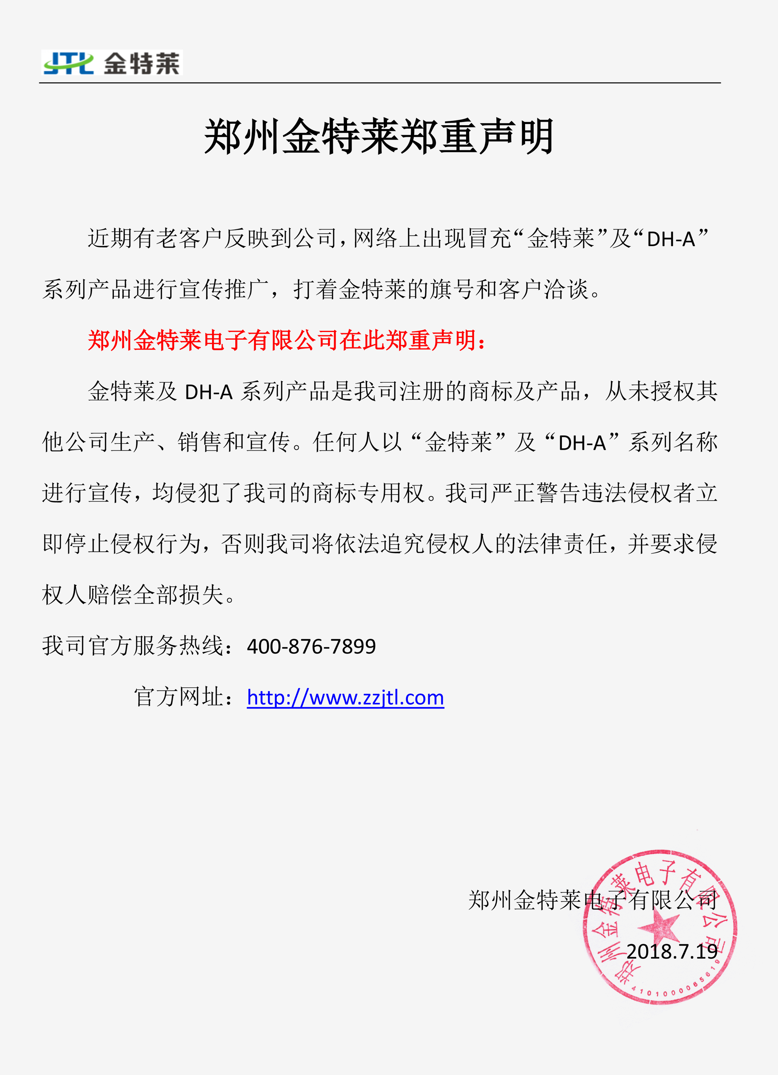 ”及“DH-A”系列名称进行宣传,均侵犯了我司的商标专用权。我司严正警告违法侵权者立即停止侵权行为,否则我司将依法追究侵权人的法律责任,并要求侵权人赔偿全部损失。